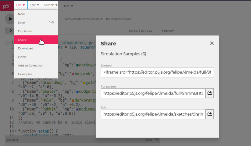 - Create p5js.org account, save sketches, share link with students / embed in Google Sites, Brightspace, etc.